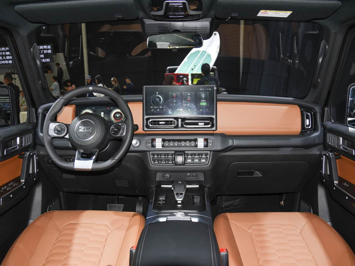 咱们领先来看新车的外不雅计算方面,车头计算是212 T01最显赫的复旧标志。蚌式发动机盖保留了经典的三谈杠中网,搭配分时势圆灯,里面镶嵌LED光源,既致意了老款212的原始好意思学,又擢升了夜间照明遵守。前保障杠经由加宽和强化,收受铁质材质,显赫擢升了接近角至40度,确保在攀爬艰涩时幸免车体受损。顶部增设的防空灯解救多角度旋转,增强了复杂地形下的视线隐敝,而避讳式绞盘选装件则进一步强化了脱困材干。这些计算共同营造出粗野而实用的视觉冲击力,彰显了越野车的实践。