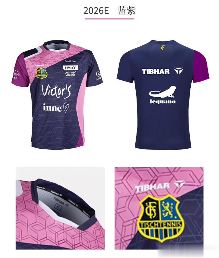 瞎想在线: 经典领悟剪裁,正面有醒诡计 “Victors inne” 字样,左胸点缀精良 黄色徽章,辨识度超高!后面更是亮点:深蓝底色+紫色袖管,超大白色“TIBHAR” LOGO + 标志性 蜥蜴图案 & “leguano” 字样 (SV / SVCHTENNIS),专科感拉满!