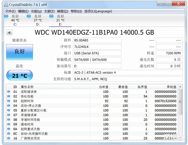 得手先测数据,内部是一块3.5寸的14T硬盘,实质可用容量12.7T,转速为7200转。